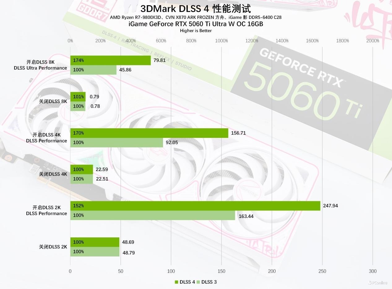 在简单介绍之后,让我们进一步探讨DLSS 4的理论性能表现,采用的是经典的3DMark测试。必须指出,当iGame RTX 5060 Ti Ultra W OC 16GB显卡与DLSS 4技术相结合时,其帧数表现仿佛注入了兴奋剂,性能的提升在开启与关闭DLSS 4前后简直是天壤之别。具体来看,在2K分辨率下,开启DLSS 4前后性能差异达到了惊人的4倍。而在4K分辨率下,帧数的差距更是达到了7倍之多。最令人震惊的是在8K分辨率下,iGame RTX 5060 Ti Ultra W OC 16GB显卡在DLSS 4的加持下能够达到80 FPS,这在DLSS 3模式下几乎是不可能实现的。这或许预示着,未来即便是中端显卡也有望轻松享受8K游戏体验。