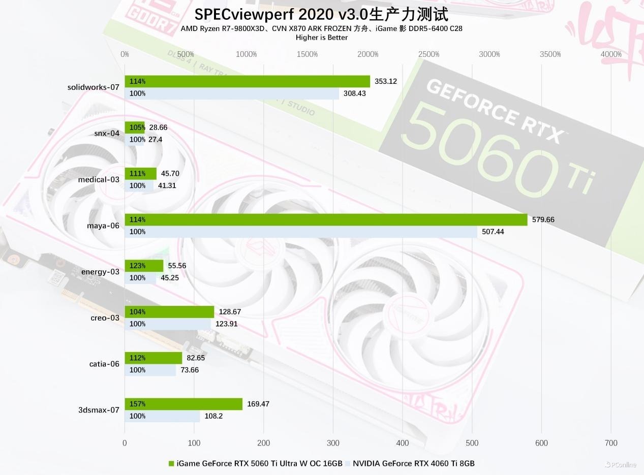 在工业领域,我们使用SPEC2020进行测试,它能够全面反映显卡的工业性能。在多项测试中,iGame RTX 5060 Ti Ultra W OC 16GB对比RTX 4060 Ti平均提升了11%~23%,在某些项目中领先幅度更大。例如,在3dsmax-07测试中,iGame RTX 5060 Ti Ultra W OC 16GB的表现比前代提升了57%!