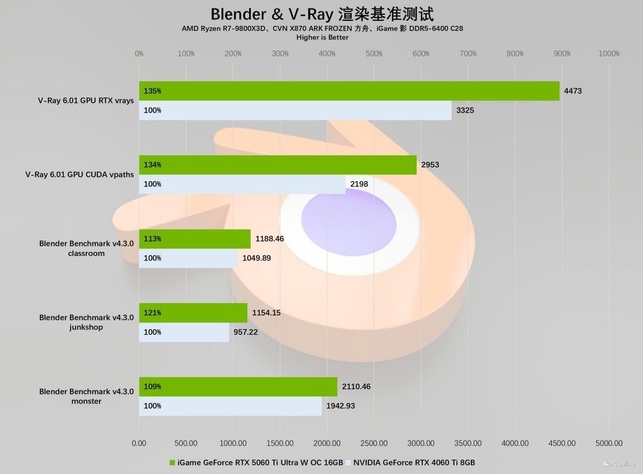 在图像视频创作领域,iGame RTX 5060 Ti Ultra W OC 16GB的优势显而易见。那么,在3D渲染创作方面,它又表现如何呢?在Blender和V-Ray这两款软件中,iGame RTX 5060 Ti Ultra W OC 16GB再次给大家带来了惊喜。在Blender中,它基本上能领先RTX 4060 Ti达9%~21%,而在V-Ray中,无论是RTX还是CUDA项目,对比40系显卡,领先幅度更是高达34%以上。