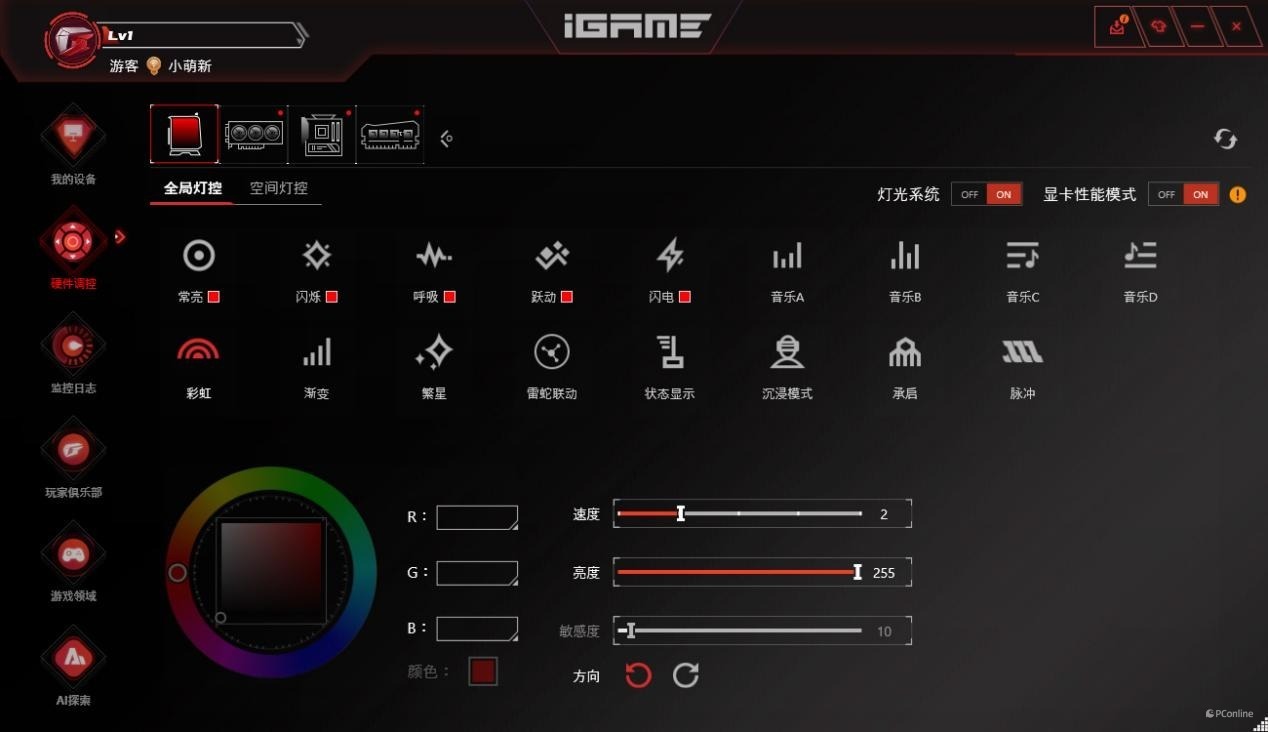 通过iGame自在星球软件,我们可以轻松调节机箱内所有支持ARGB灯效的硬件,包括iGame RTX 5060 Ti Ultra W OC 16GB显卡、主板、散热器冷头、风扇以及内存条等,实现ARGB灯光同步。