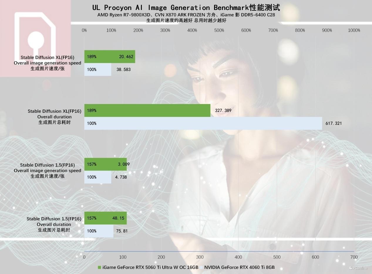 看过了FP4以及FP8,我们再看看iGame RTX 5060 Ti Ultra W OC 16GB在Stable Diffusion中FP16下的表现如何,还是用UL Procyon进行测试,在比较轻松的SD 1.5文生图测试里,iGame RTX 5060 Ti Ultra W OC 16GB的表现非常优秀,生成一张图的速度仅需48.15秒,效率比上代显卡快了57%。而即便是在压力比较大的SDXL中,优势也非常明显,生成一张图的速度为20.462秒,同样领先RTX 4060 Ti约89%。
