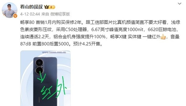 售价方面,媒体预测新机起售价为1000-1200元,叠加“以旧换新”补贴后价格或更低。上述博主透露,华为畅享80或于4月25日直接开售,但官方尚未确认具体日期。