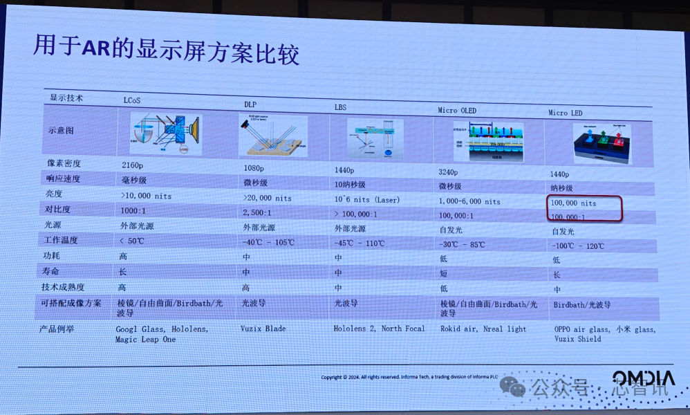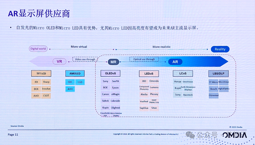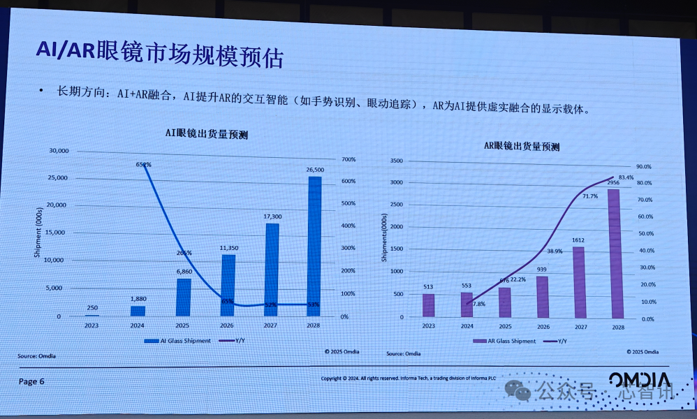 在AR眼镜方面,目前主要是作为信息提示类应用,主要是搭配单滤光加光波导方案越来越多。从Omdia的预测来看,更长期的大幅增长主要是发生在2027年、2028年,这是因为预计那个时间点整个光学方案及显示技术应该可以有比较好的突破,尤其是彩色方案的LED。现在虽然有彩色,但是用合色的方式表现并不好。长期来看,Omdia认为AI和AR眼镜未来会走向融合。