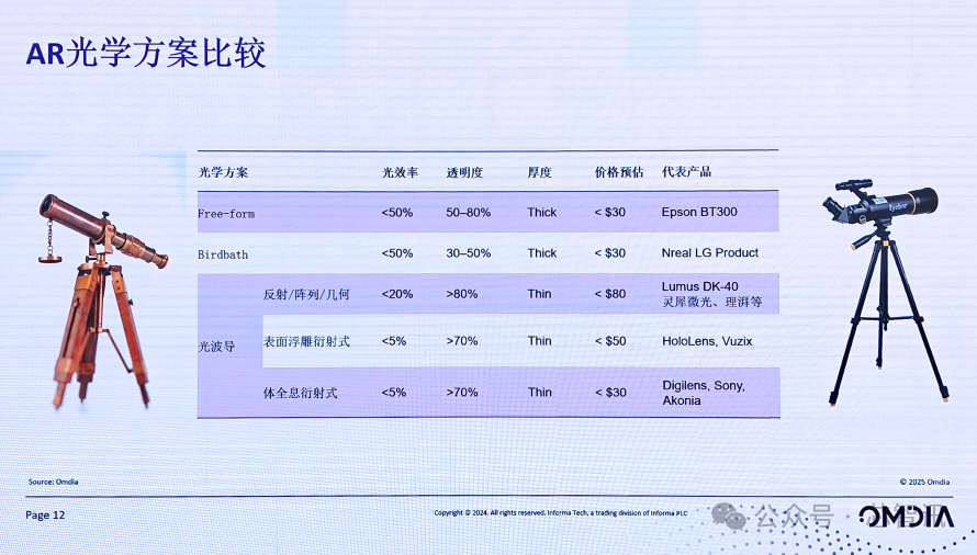 目前光学的发展缓慢很大程度上影响了AR眼镜的突破。Free-form和Birdbath光学方案主要是搭配Micro OLED显示屏,而光波导方案主要是做信息提示类、运动类的。目前用的比较多的是几何光波导方案,它的光学效率比较好,但是它的缺点是良率实在是不是很好,成本也比较高,目前大约在80是美金。目前中国厂商也是着力在衍射光波导方面进行努力。