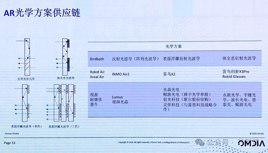 在衍射光波导供应链方面,相对来说目前“表面浮雕衍射光波导”比较成熟,用紫外纳米压印技术。除了技术本身之外,供应链的厂商已经开始了他们的合纵连横。一些ODM厂商已经开始纷纷把手伸向了这些光学方案的厂商,以及进行交叉入股等方式,对产业发展是一个正向积极的作用。