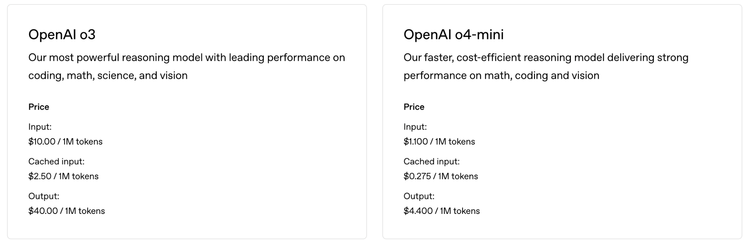 在定价方面,o3的每百万输入 token 收费为 10 美元,输出 token 为 40 美元;而 o4-mini 的价格仅为其十分之一左右,分别为 1.1 美元和 4.4 美元。
