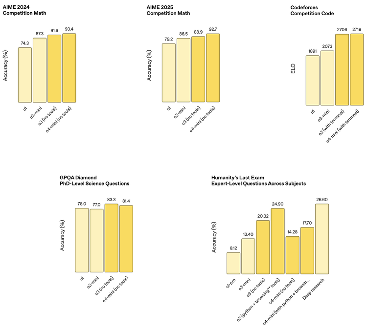 o4-mini 则是一款针对速度和成本效益优化的“小钢炮”。虽然体量更小,但它在数学、编码和视觉任务上实现了“令人瞩目的性能”,堪称“以小博大”的典范。它在AIME 2024和2025数学竞赛基准上的表现甚至超越了更大的模型。专家评估也指出,即使在非STEM领域和数据科学方面,o4-mini也优于其前代o3-mini。得益于更高的效率,o4-mini能够支持比o3显著更高的使用限制,这使其非常适合需要进行大量推理、高吞吐量的应用场景。同时,OpenAI表示,o3和o4-mini在交互时也应该感觉更自然、更像对话,能更好地利用记忆和上下文信息,并提供带有网络来源引用的、更可验证的回应。