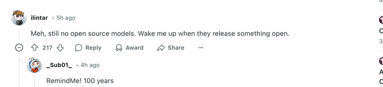 同时,开源社区中也存在一些失望的声音,指出尽管模型能力日新月异,但OpenAI仍未推出真正强大的开源模型,这让部分期待开放生态的开发者发出了“Wake me up when they release something open”(等他们发布开源模型再叫醒我)的调侃。