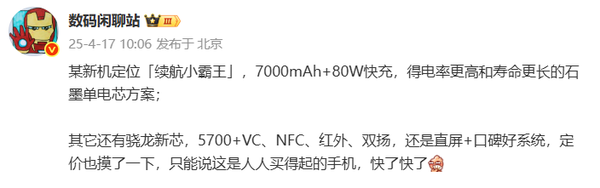 从曝光的核心参数来看,该机在续航与便携性间取得平衡。机身尺寸控制在163.21×76.13×8.45毫米,重量为208克,握持感相对均衡。配备6.67英寸AMOLED直屏,分辨率达到2400×1080像素,显示效果清晰细腻。电池额定容量6820mAh(典型值约7000mAh),配合80W超级闪充技术,有效缓解续航焦虑。