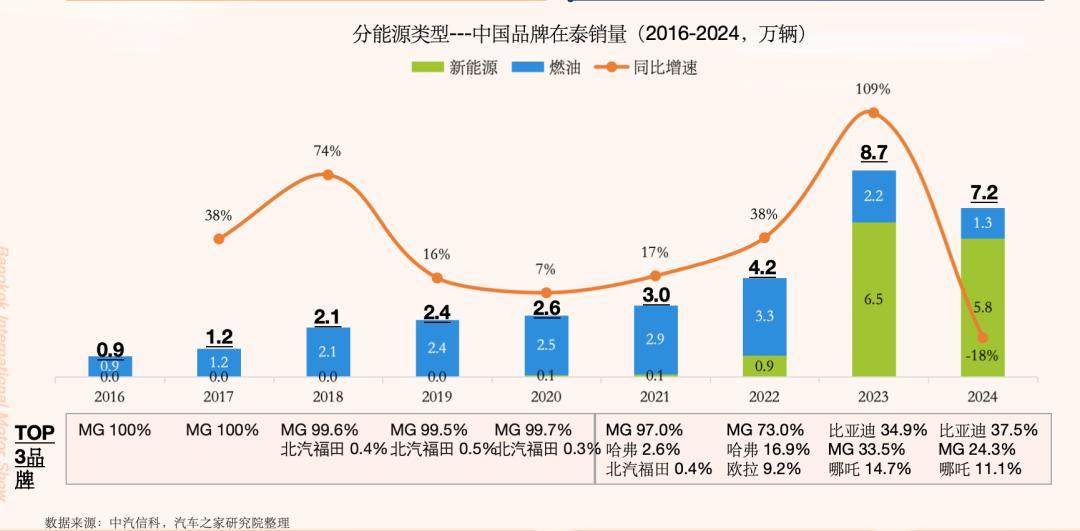 当然,上面提到的这些问题,不止MG遇到过,中国品牌在泰国市场几乎都遇到过。2024年,几乎所有中国品牌在泰国市场都出现了下滑,MG品牌36%的跌幅也不是垫底者。