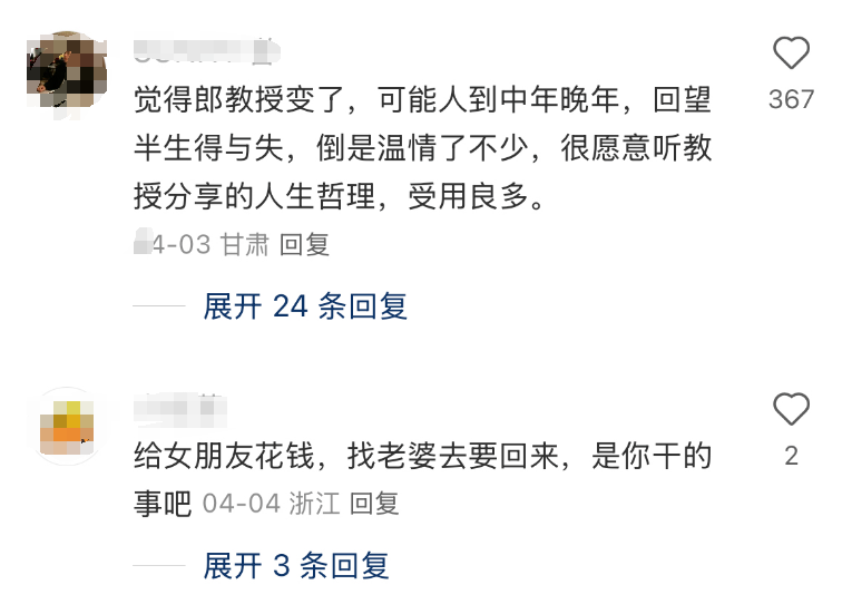 郎咸平口才一流,引得很多网友对此留言表示支持,夸他在“温柔”地回望过去的得与失。也有人质疑:一个亲人背刺可能是亲戚的错,但母亲、儿子、兄弟姐妹、前妻现任都有问题,郎咸平是不是该反省一下自己?
