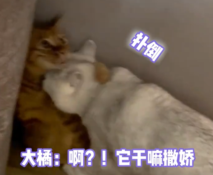 这都不算啥,大白甚至还喵呜喵呜撒起娇了,彻底把橘给整不会了。