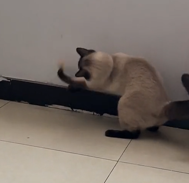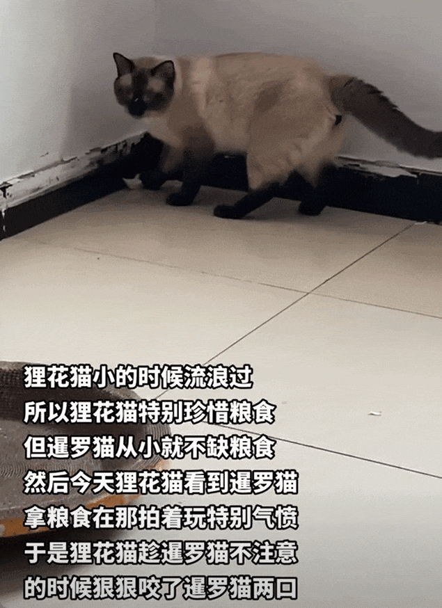 而狸花猫因为流浪过,对粮食非常珍视,完全见不得暹罗拿粮食当玩具玩的恶劣行径。