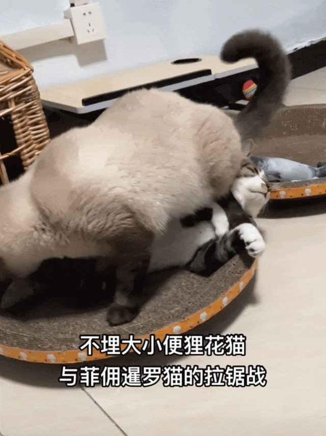 譬如:每次暹罗路过狸花,都会悄咪咪拿大脚踩它,然后一屁股坐在狸花身上,企图用自己的胖身子给狸花坐个半死。