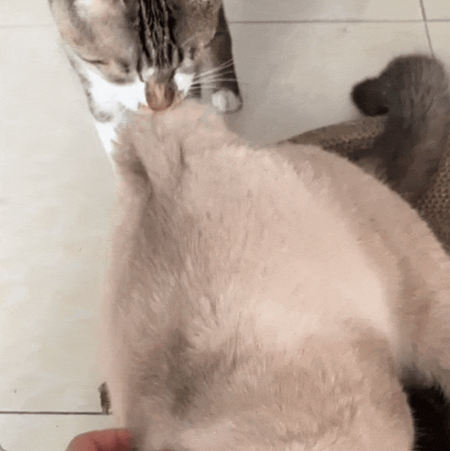 于是它经常装作若无其事,假借给狸花舔毛之名,实则舔着舔着就会一口咬上去,就算吃了一嘴的猫毛也不放弃。