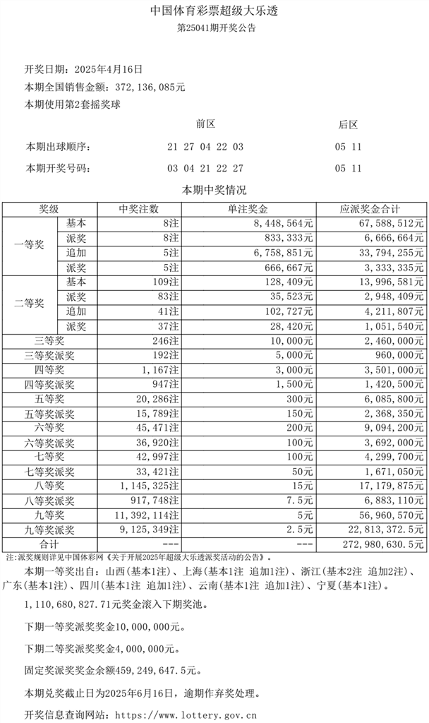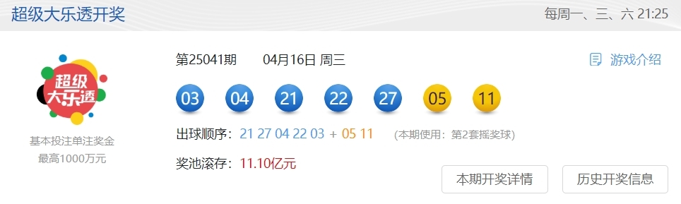 4月16日,超级大乐透第25041期开奖。前区开出号码03、04、21、22、27;后区开出号码05、11。本期全国销售3.72亿元,为国家筹集彩票公益金1.33亿元。