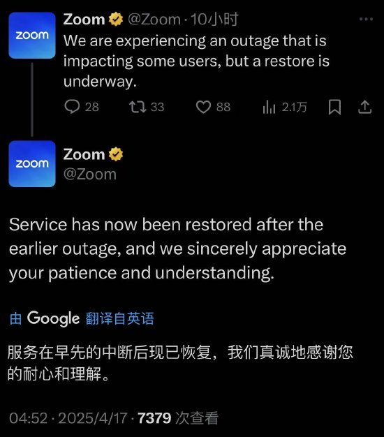 Zoom的一位发言人在邮件中表示,公司已意识到 “一些用户正在经历服务中断”,但没有说明出现问题的原因。美国东部时间下午4点52分,Zoom在X账号上发布消息称服务已恢复。