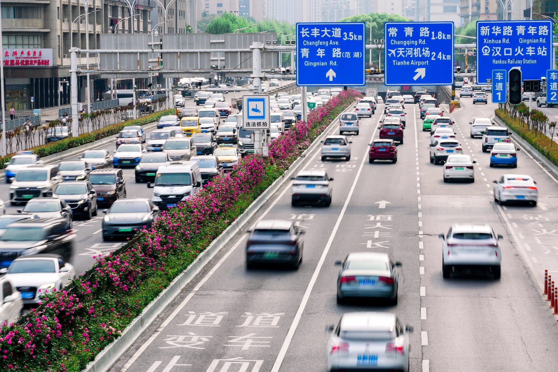 近期,武汉城区主干道和高架桥的月季花悄然绽放,变成繁花织就的长廊,形成了“一路花开”的春日盛景,吸引不少市民拍照记录。
