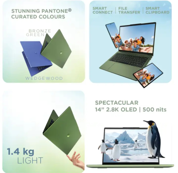 Moto Book 60提供青铜绿与楔木蓝两种配色,售价方面:Core i5(16GB+512GB)版本为66990卢比(约5720元),Core i7有两个版本,512GB为74990卢比(约6403元),1TB版为78990卢比(约6745元)。首发优惠价低至61999卢比(约5300元),同样将于4月23日起正式开售。