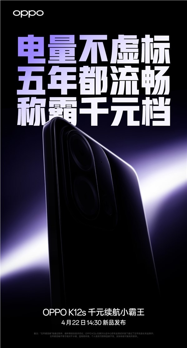 站长之家 4月17日 消息:近日,智能手机品牌OPPO正式对外宣布,其全新力作OPPO K12s将于4月22日下午14点30分震撼登场,这款新机自曝光以来便以“千元续航小霸王”的美誉吸引了众多消费者的目光,官方更是自信宣称其能“五年都流畅”,誓要在千元价位段树立新标杆。