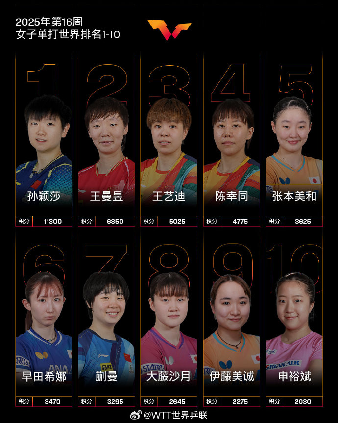 4月15日,国际乒联公布了2025年第16周世界排名。王曼昱排名第二,张本美和位列第5。