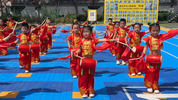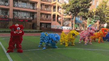 西安市雁塔区科创路小学学生在操场上舞狮