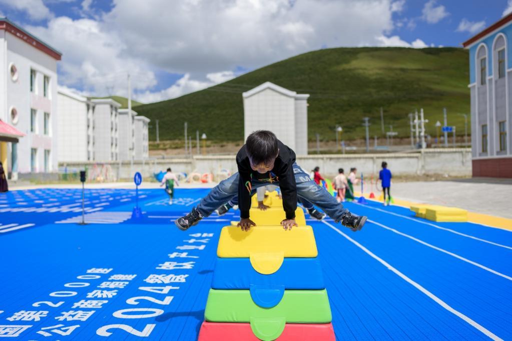 青海省果洛州达日县阳光小区幼儿园里的儿童在做运动