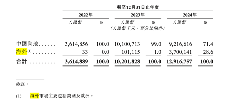 报告期内,海辰储能海外收入实现大幅增长,分别为3.3万元、1.01亿元、37亿元,海外业务收入占比由2023年的1%提升至2024年的28.6%。其中,海外客户主要在美国及欧洲,海外销售毛利率高达42.3%,是公司重要的利润来源;与此同时,海辰储能在中国内地的收入占比由2022年的100%下降至2024年的71.4%。
