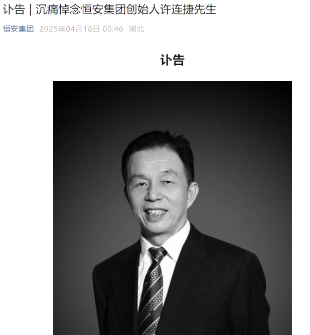 4月17日,恒安集团创始人、福建商界标志性人物许连捷因病逝世,享年73岁。这一消息由恒安集团官微及治丧委员会发布,引发商界与公众的广泛关注。