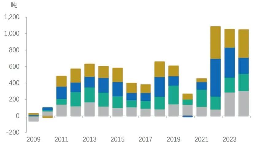 2008-2021年,全球央行每年购金量大致为500吨,而全球黄金每年需求量为4500吨,央行购金占比为11%,对金价走势影响较为有限。而2022-2024年,央行购金连续三年购金超1000吨,占总需求量20%以上,对金价的影响更大了。