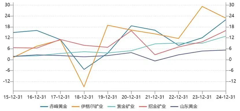 黄金业务占比高,金价持续上涨,则对于利润端的贡献会更大,且弹性会更好。2024年,赤峰黄金归母净利润增长119%,增速快于多数国内金企。