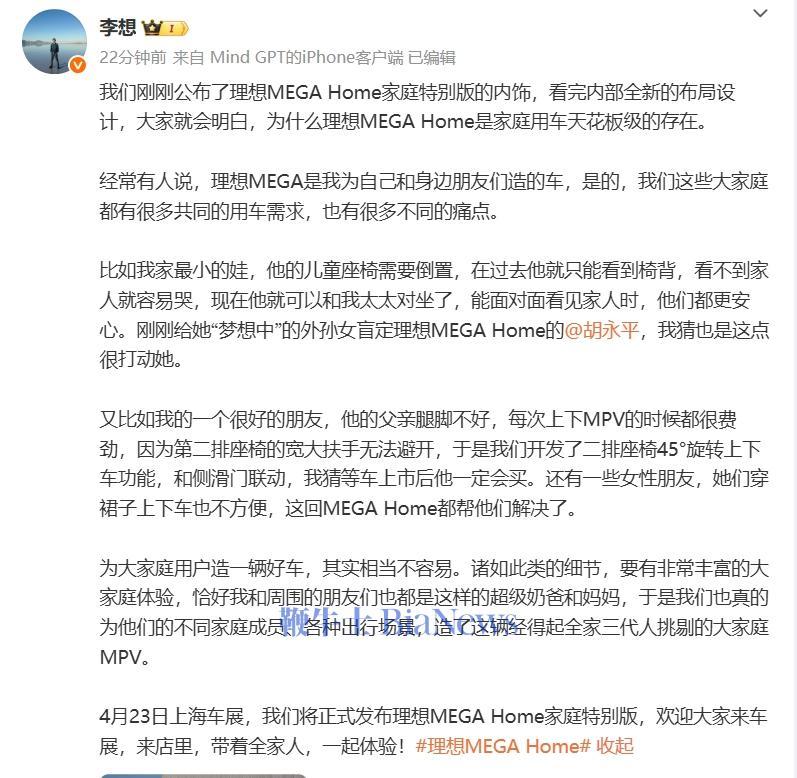 4月18日,理想汽车CEO李想在微博发文称,看完理想MEGA Home家庭特别版内部全新的布局设计,大家就会明白,为什么理想MEGA Home是家庭用车天花板级的存在。