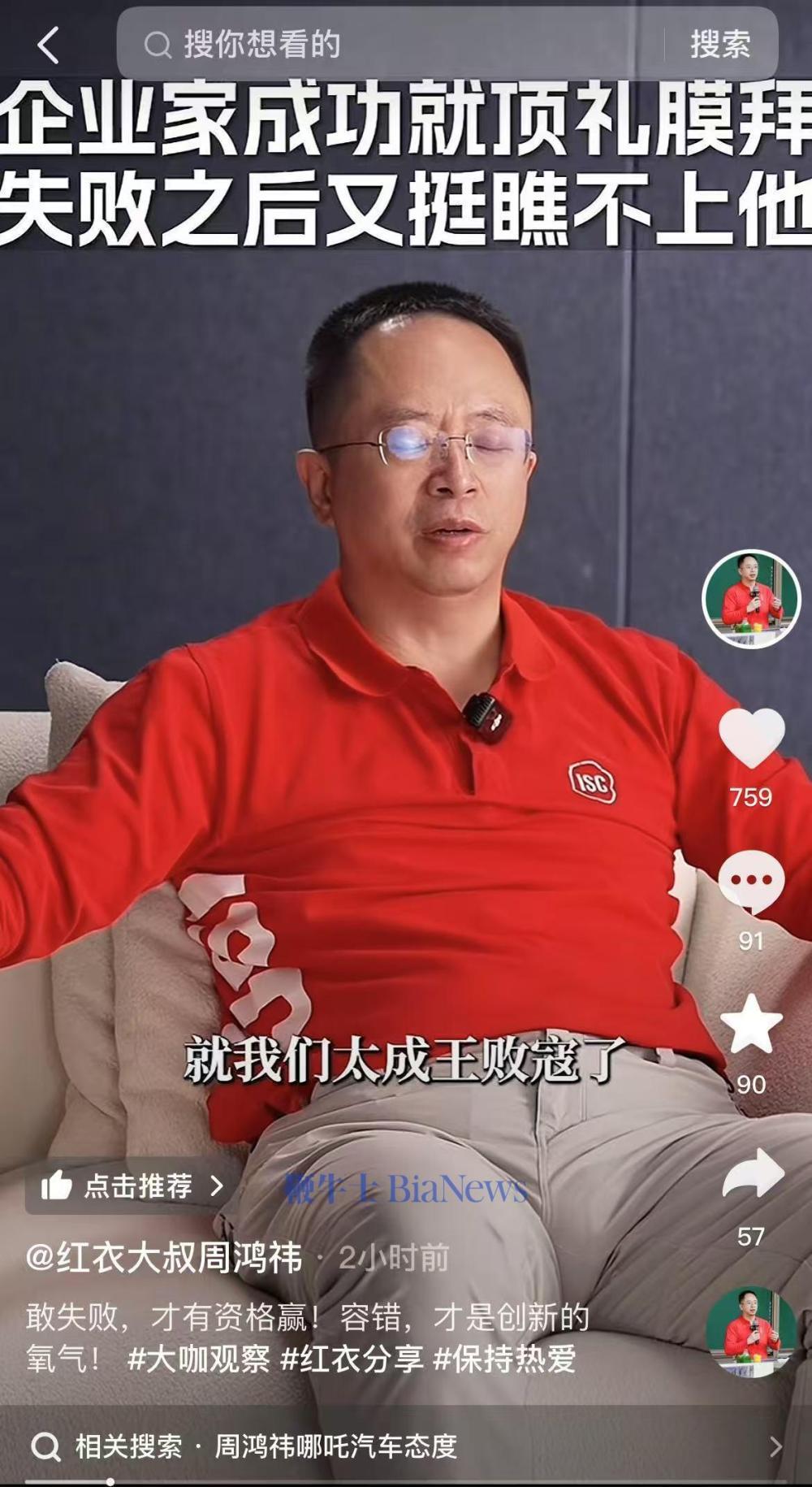 4月18日,周鸿祎在社交平台发布了一条标题为“企业家成功就顶礼膜拜,失败之后又挺瞧不上他”的视频,并配文“敢失败,才有资格赢!容错,才是创新的氧气!”