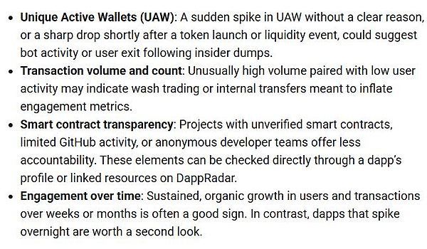 DappRadar 分析师 Sara Gherghelas 表示,有几个危险信号可能预示着一个项目是骗局。来源:DappRadar