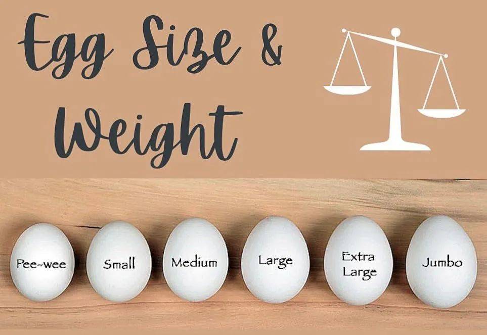 鸡蛋按大小可以分为:Jumbo巨大,Extra Large特大,Large大号,Medium中号,small小号,Pee wee特小号。