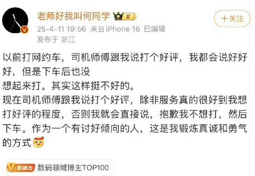 继去年被质疑抄袭后,何同学再度陷入舆论漩涡 , 起因是他在微博发布拒绝网约车司机好评的言论,并表示 这是他锻炼真诚和勇气的方式 。