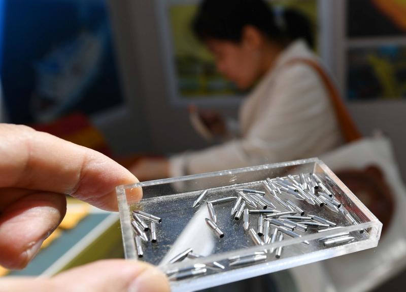 旁边的展台上,冶金学院研二女生张丽看着学校的“5G钢”录取通知书,羡慕地说:“要是晚几年入学也能拿到这么高科技的通知书了”。北科大从前年开始用该校教师和校友团队研发的“5G钢”制作本科新生录取通知书。这种钢厚度最薄可达0.07毫米,主要为5G基站信号接收器、集成电路板等用钢,打破了国外技术垄断并实现高品质超薄钢的自主生产。旁边几位同学正在用“蚕丝钢”缠绕“钢小伙”“铁姑娘”字样的钢绣。这种如蚕丝般纤细和强韧的钢丝在民用和军事领域都大有作为,让同学们赞叹不已。