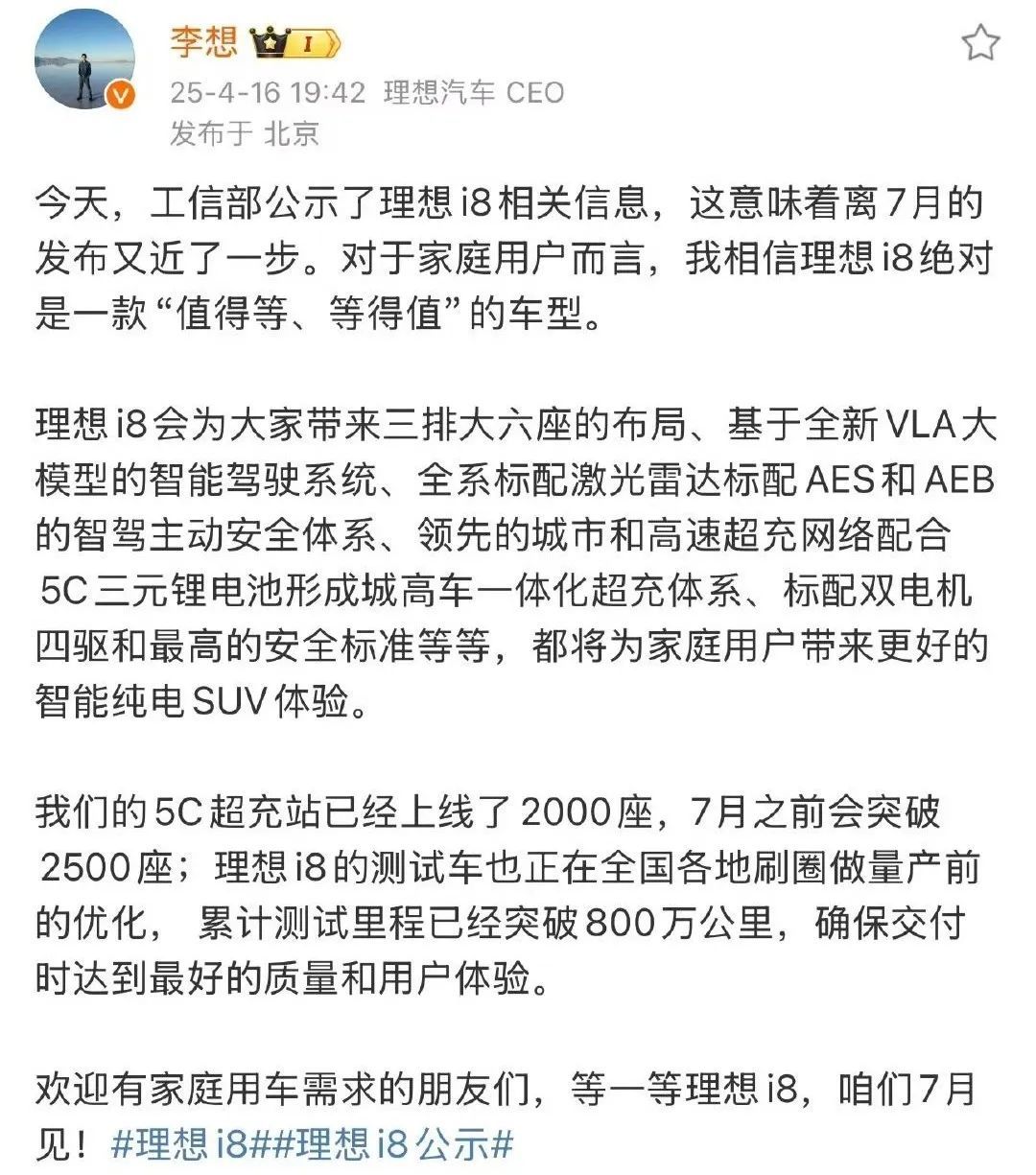 在工信部公示后,李想也下场预热,透露i8测试车正在全国刷圈做量产前优化,累计测试里程已突破800万公里。这绝对是一款“值得等、等得值”的车型!