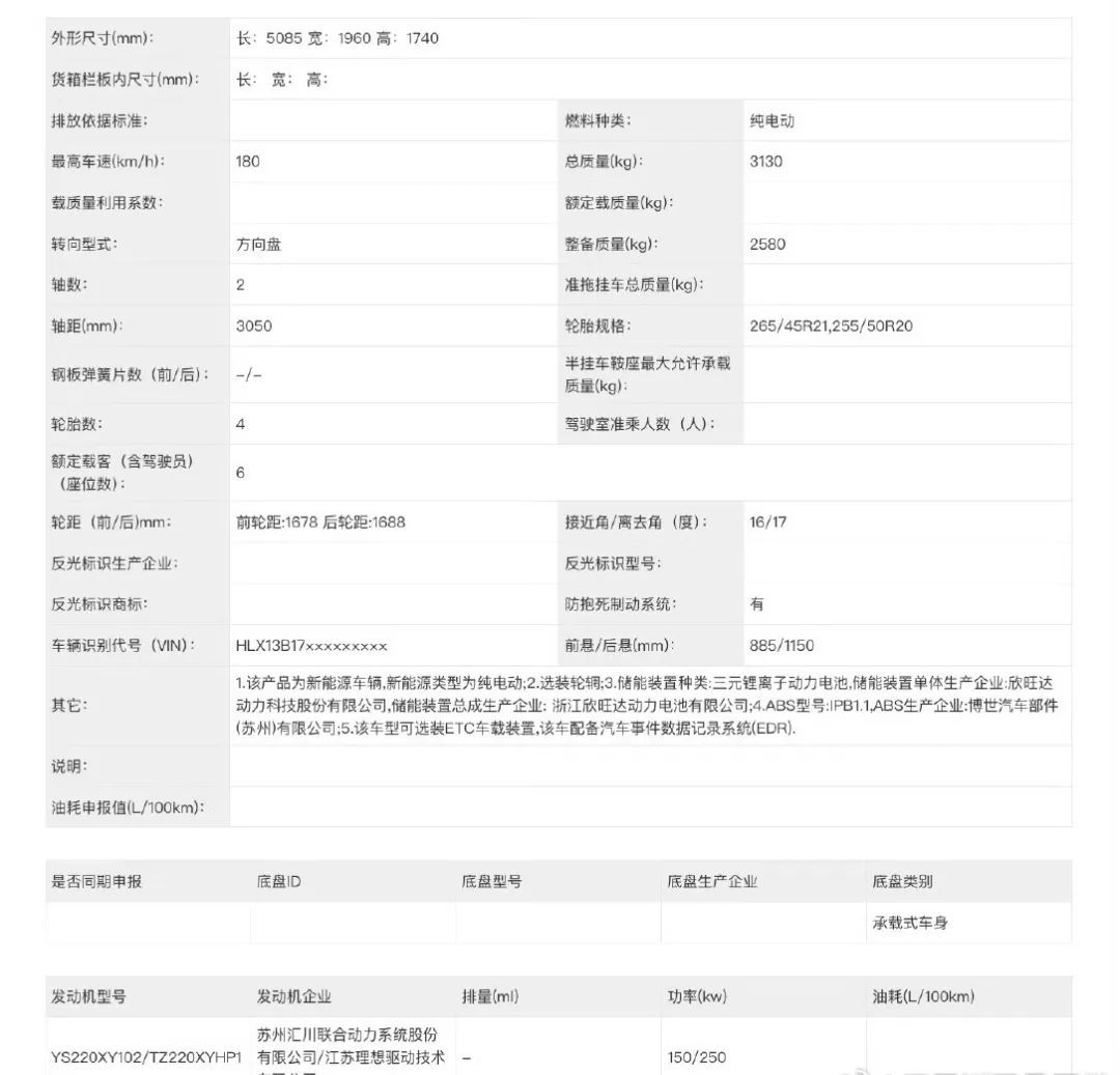 这车定位中型SUV,还是延续原型车设计,动力系统申报的均为单电机版,最大功率为205kW,最高车速200km/h,均采用宁德时代三元锂电池,并支持800V高压补能。