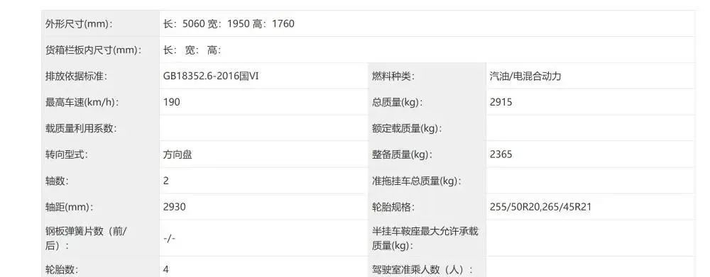 动力方面,目前仅一款搭载1.5T插混动力总成,发动机最大功率118kW(约合160匹马力),驱动电机功率没有给,但有三元锂电池组。整车质量达到2365千克,电池容量表现应该还不错。