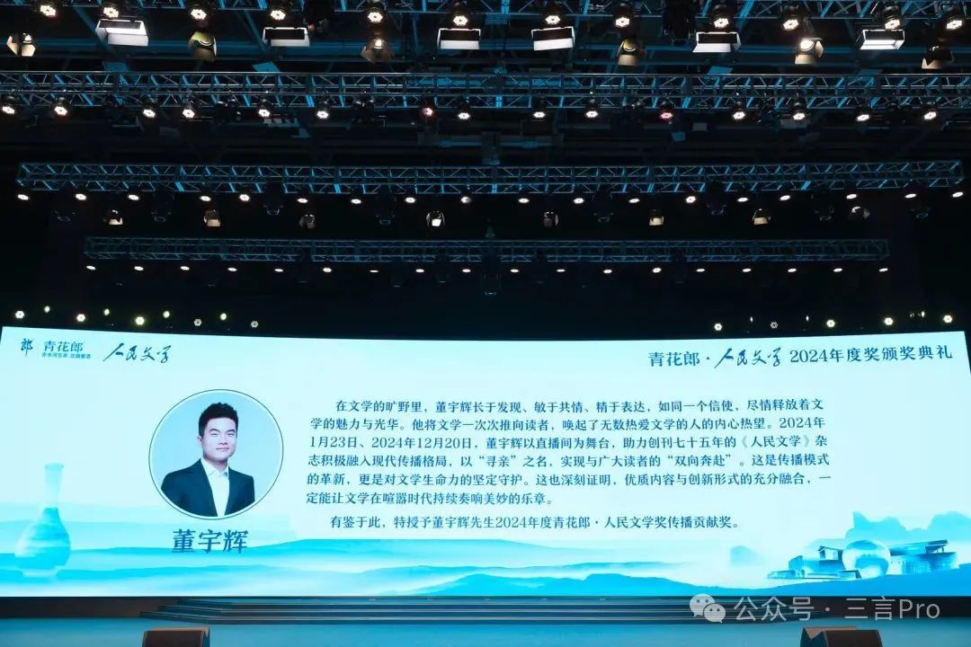 有鉴于此,特授予董宇辉先生2024年度人民文学奖传播贡献奖。