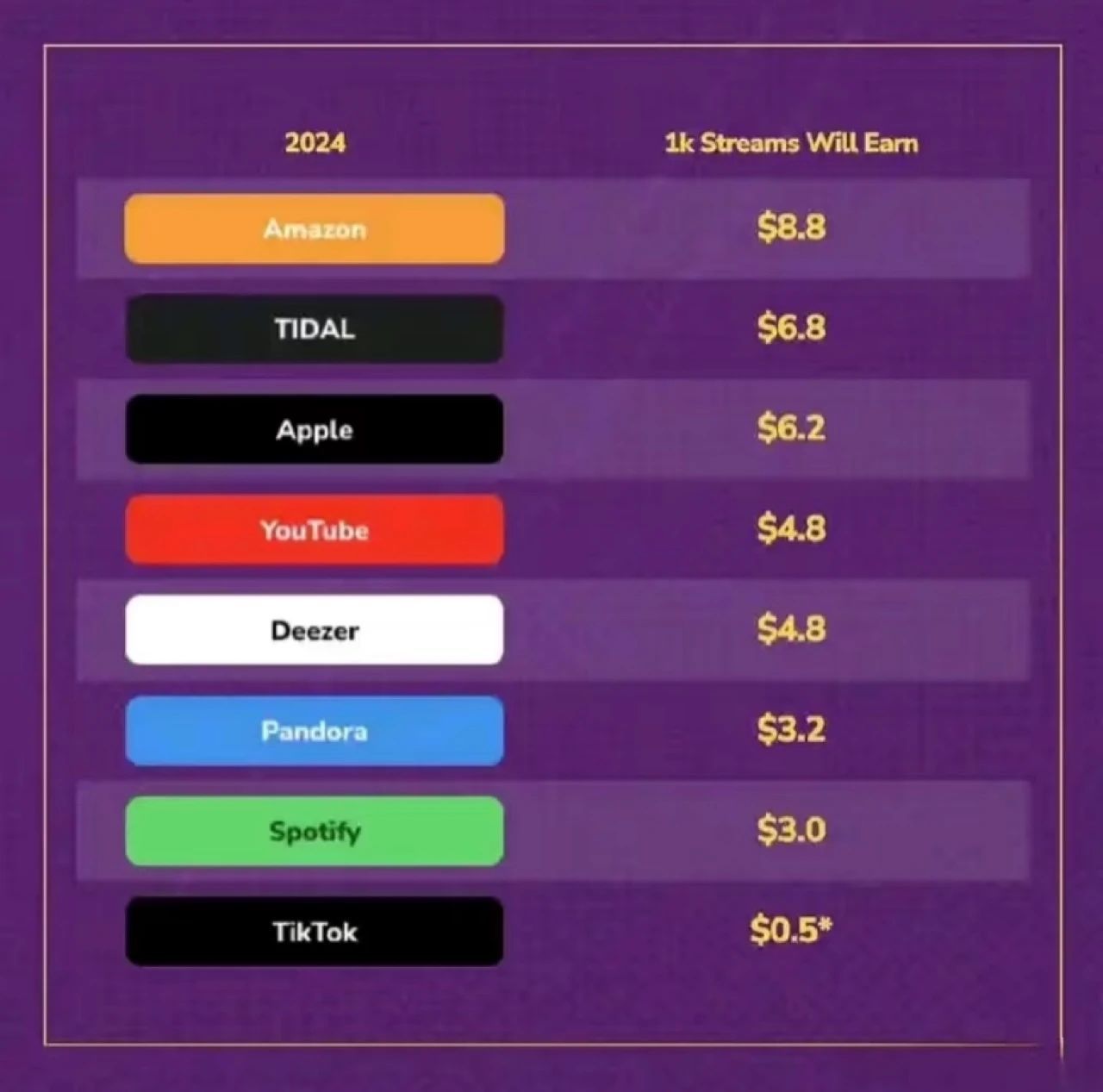 每一千次播放最高收益来自亚马逊音乐 Amazon Music。