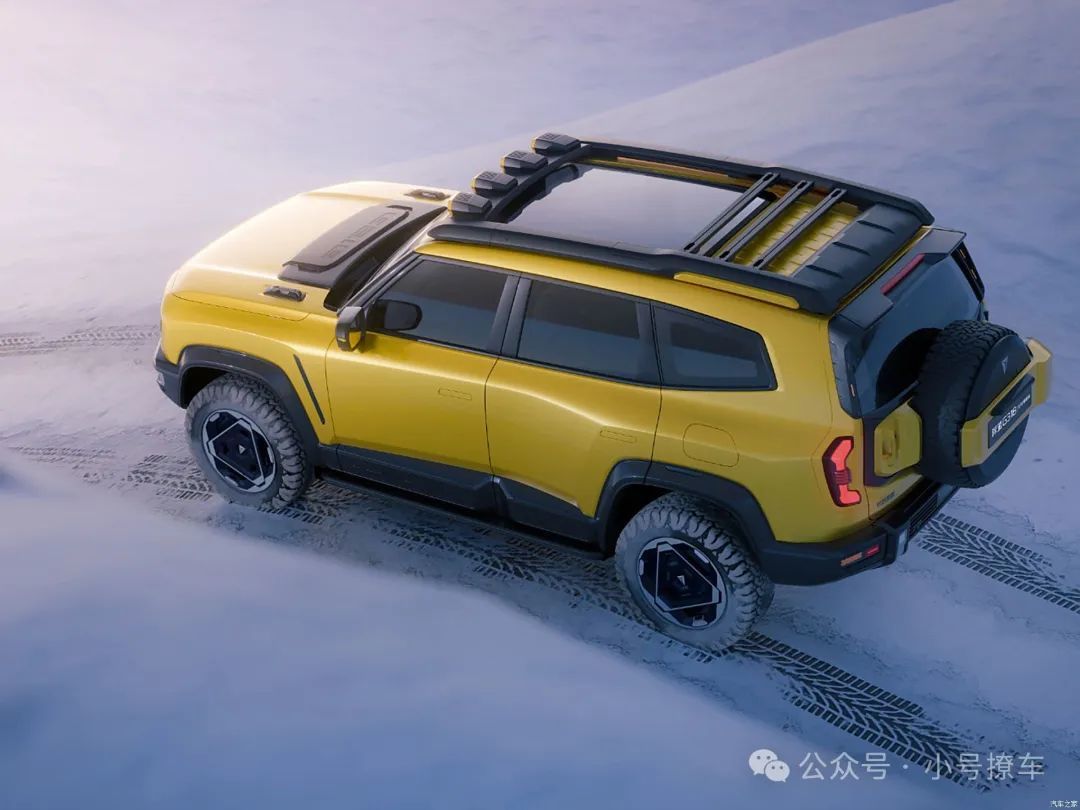 尾部外形方面,车顶配备有立体感十足的扰流板,备胎采用了外挂式全尺寸备胎,尾门采用了侧开设计,同样是硬派SUV常见的设计语言;下包围部分配备有粗壮的黑色饰板,底部配备有银灰色防擦板,两侧击沉有扁平的雾灯。