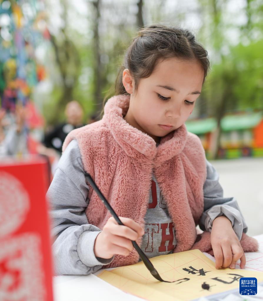 4月19日,在哈萨克斯坦阿拉木图,一名女孩在“国际中文日”庆祝活动上学书法。