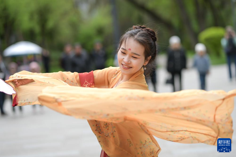 4月19日,在哈萨克斯坦阿拉木图,“国际中文日”庆祝活动的参与者身着中国传统服饰跳舞。