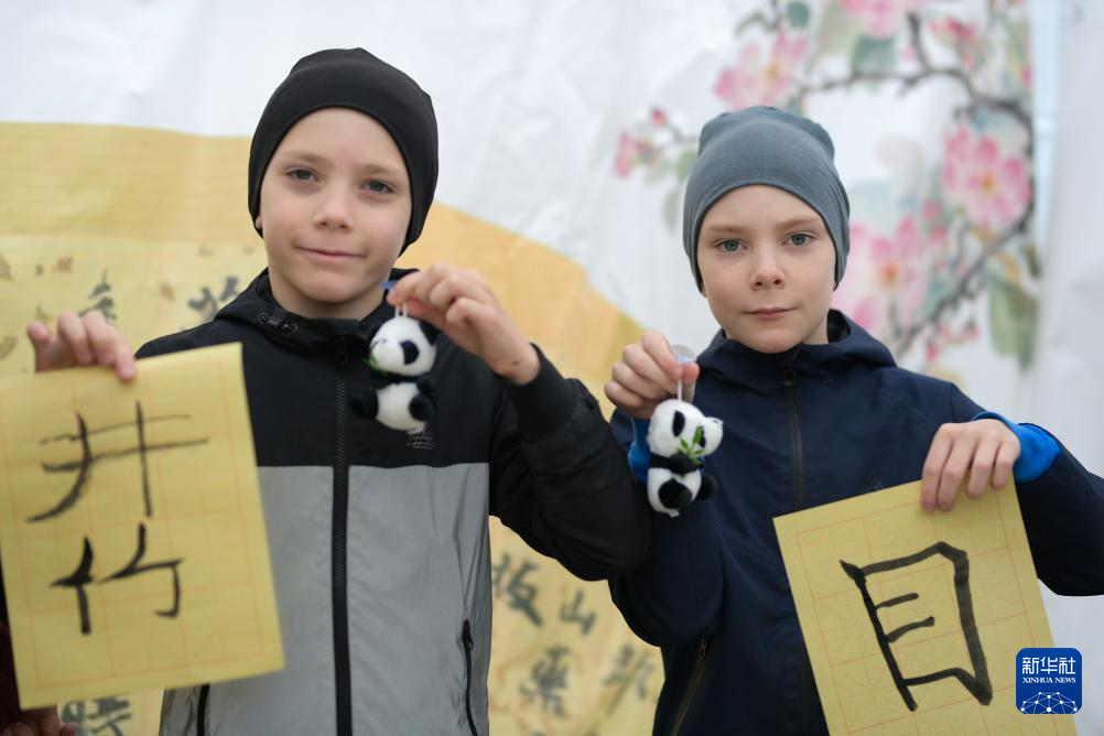 4月19日,在哈萨克斯坦阿拉木图,两名男孩在“国际中文日”庆祝活动上展示自己的书法。