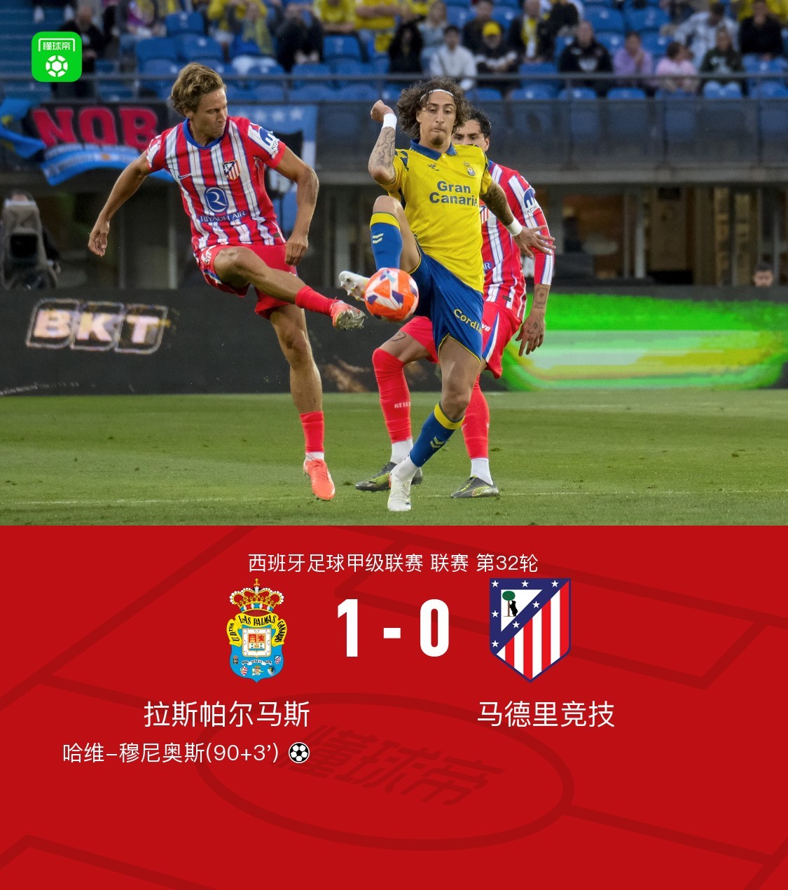北京时间4月20日,西班牙足球甲级联赛第32轮,拉斯帕尔马斯主场迎战马德里竞技。上半场,阿尔瓦雷斯近距离射门遭遇神扑。下半场补时阶段,哈维-穆尼奥斯破门完成绝杀。全场比赛结束,马竞客场0-1不敌拉斯帕尔马斯。