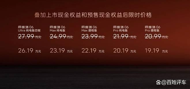 与此同时,即日起至2025年5月7日24:00,下定阿维塔06的用户可享受至高61000元的八大限时权益,包括:大定定金5,000元抵扣10000元车价,限时上市补贴10000元,价值20,000元 ADS 高阶功能包等额抵扣券,还有价值6,000元的运动套件、价值2,000元的20寸气旋五幅运动轮毂免费送,价值10,000元的25扬英国之宝·卓越之声音响系统、价值8,000元的前排智能电动门免费升级,及面向Ultra车型用户价值12,000元的超清电子外后视镜套装限时免费升级。