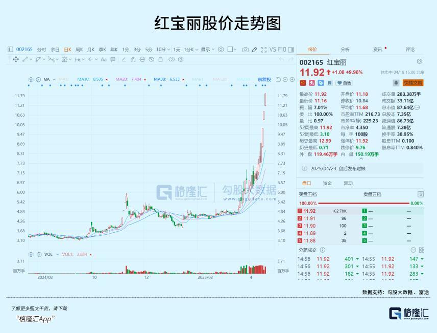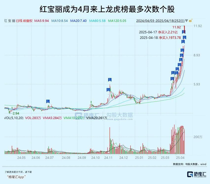 龙虎榜上,4月以来红宝丽累计有9天入榜单,各路机构、游资和知名散户大V如“佛山系”、“上海超短帮”、“消闲派”都轮番热炒了一轮又一轮,单日成交额多次超过30亿元,换手率多日超过40%。