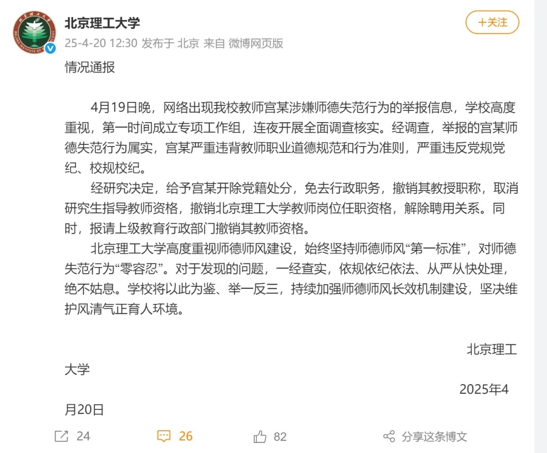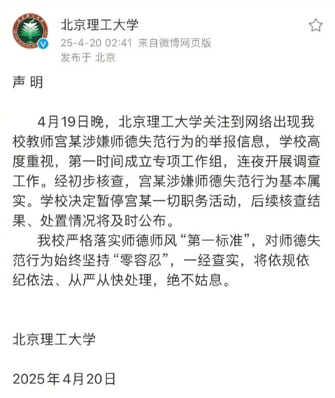 4月19日晚,北京理工大学关注到网络出现我校教师宫某涉嫌师德失范行为的举报信息,学校高度重视,第一时间成立专项工作组,连夜开展调查工作。经初步核查,宫某涉嫌师德失范行为基本属实。学校决定暂停宫某一切职务活动,后续核查结果、处置情况将及时公布。
